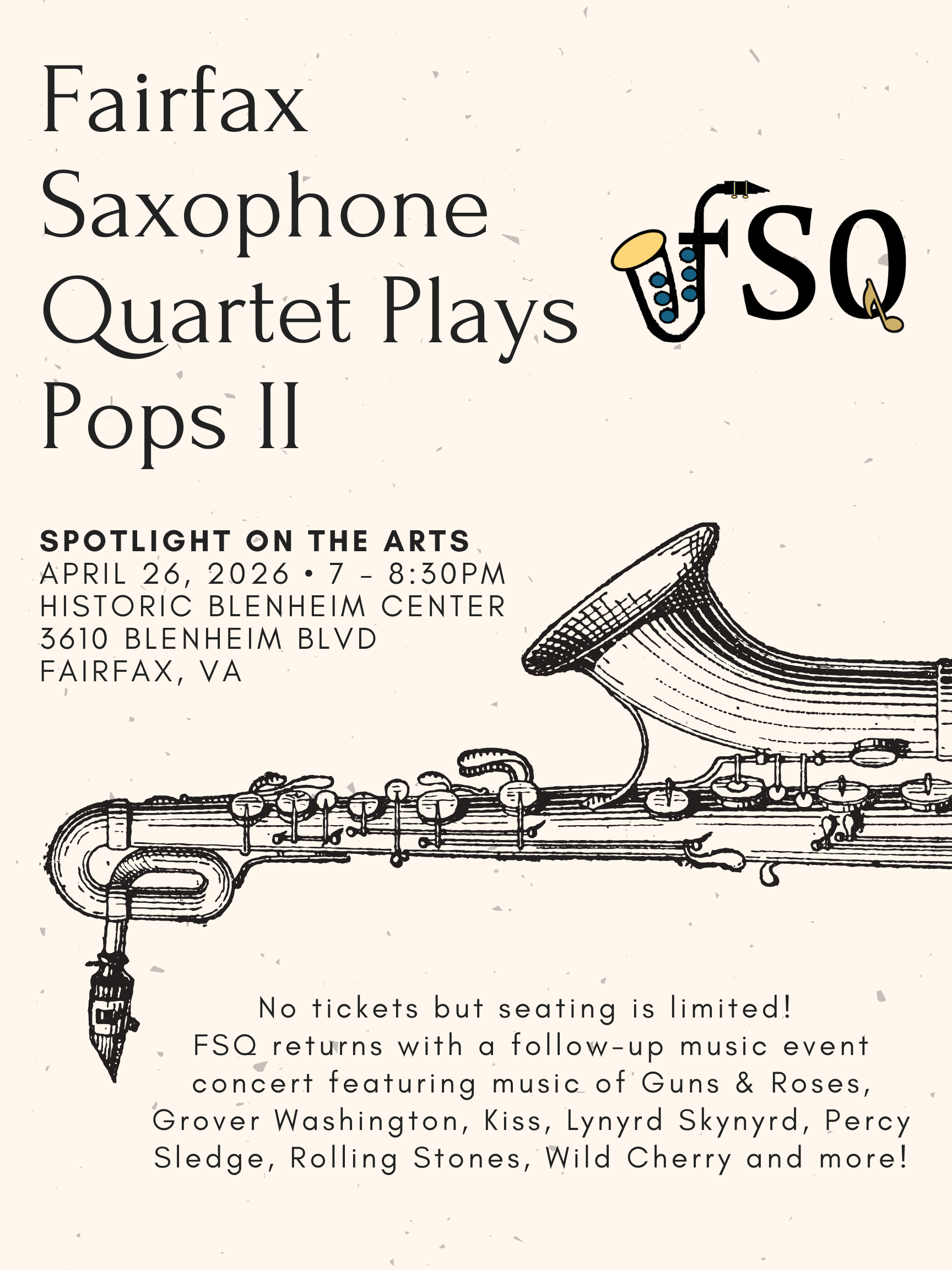 Fairfax Saxophone Quartet, “FSQ Plays Pops II – Spotlight 2026″, @HistoricBlenheimCenter (Fairfax, VA)